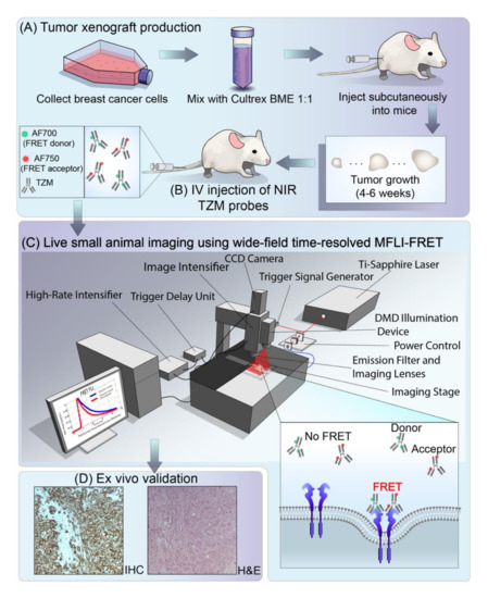 After validation of TZM–HER2 FLIM-FRET in vitro, we tested whether TZM–HER2 binding could be detected in vivo using MFLI-FRET imaging of nude mice bearing AU565 tumor xenografts. Figure 5 illustrates the principles of detecting molecular events of antibody–receptor binding in undisturbed tumor xenografts using MFLI-FRET imager. Firstly, tumor xenografts are implanted in nude mice using AU565 HER2 positive human breast cancer cells (Figure 5A). Secondly, upon adequate tumor growth, mice are intravenously injected with TZM–AF700 (donor only; A:D = 0:1) or TZM–AF700/TZM–AF750 donor/acceptor FRET pairs at A:D = 2:1 (Figure 5B). Thirdly, 24–72 h post-injection, anesthetized animals are subjected to whole-body non-invasive MFLI-FRET imaging (Figure 5C). Finally, tumors are extracted and subjected to ex vivo validation using immunohistochemical (IHC) analysis (Figure 5D).