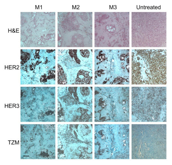 IHC ex vivo validation confirms TZM accumulation in the cancer cells both positive for HER2 and HER3. Consecutive sections of tumors M1–M3 and tumor from untreated mouse were processed for H&E staining, anti-HER2, anti-HER3, and anti-TZM immunohistochemical staining. NovaRED was used as peroxidase substrate (brown stain), tissue was counterstained with methyl green. Scale bar = 100 µm.