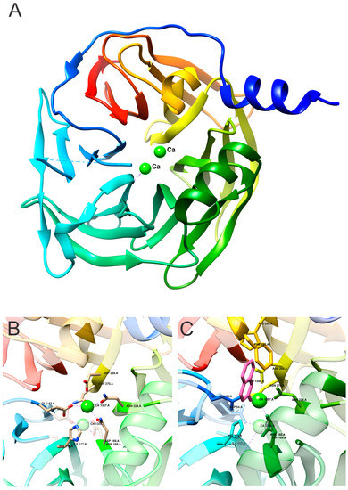 To date, several structures of PON1 have become available. One of them is in complex with the competitive inhibitor 2HQ (Figure 4C). 2HQ lactam is a nonhydrolyzable lactone analogue in which esteric oxygen is replaced by NH. The corresponding lactone DHC is normally hydrolyzed by PON1 and is used as a substrate to test protein activity [30]. The binding of the inhibitor does not cause any significant changes to the structure of the active site. 2HQ does not interact only with Ca1 in the active site but also with the side chains of H115, D269, E53, and N168 (Figure 4C).