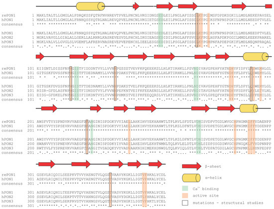 Sequence alignment of recombinant PON1 (rePON1) and human PON1 (hPON1). The rePON1 protein sequence used for structural studies is from the protein database—PDB id: 1V04. The hPON1, hPON2, and hPON3 sequences are from the UniProt database—P27169, Q15165, and Q15166, respectively. In consensus line (*) is annotating conserved sequence, (.) is annotating conservative mutations and ( ) is annotating nonconservative mutations. Multiple sequence alignment was performed by T-Coffee, and Boxshade was used for alignment presentation. Secondary structure annotation, Ca2+ binding sites (both structural and catalytic ion), and active site residues are adapted from (as marked by different colors) [28]. The point mutations that were also evaluated by structural studies are annotated according to PDB id sequences: 4HHO, 4HHQ [46], 4Q1U [47], 6G82, 6GMU, and 6H0A [49].