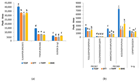 Effect of different reducing agents on (a) quantifier peptides and (b) cystine-containing peptides of ATIs P81367, P81368 and β-lactoglobulin (β-Lg). Iodoacetamide was used as alkylating agent. Reducing agents: TCEP-Tris (2 carboxyethyl) phosphine; DTT-dithiothreitol; THPP-Tris(hydroxypropyl)phosphine; BME-beta-mercaptoethanol. Data are expressed as means ± standard deviation, n = 3. Comparisons were performed per family and different letters indicate significantly different values (p < 0.05).