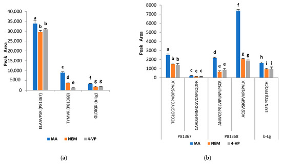 Effect of different alkylating agents on (a) quantifier peptides and (b) cystine-containing peptides of ATIs P81367, P81368 and β-lactoglobulin (β-Lg). Tris (2 carboxyethyl) phosphine (TCEP) was used as a reducing agent. Alkylating agents: IAA—iodoacetamide; NEM—N-ethylmaleimide and 4-VP—4-vinylpyridine. Data are expressed as means ± standard deviation, n = 3. Comparisons were performed per family and different letters indicate significantly different values (p < 0.05).
