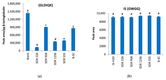 Effects of the matrix of sorghum cultivars SOR 226, 958, 1236, 555 and B.Sc on (a) β-lactoglobulin and (b) internal standard. Data are expressed as means ± standard deviation, n = 3. Different letters indicate significantly different values (p < 0.05).