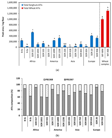 Comparison of (a) relative ATIs content of sorghum samples expressed in peak area/mg flour and (b) proteins P81367 and P81368 distribution. Data are expressed as means ± standard deviation, n = 3. Different letters indicate significantly different values (p < 0.05).