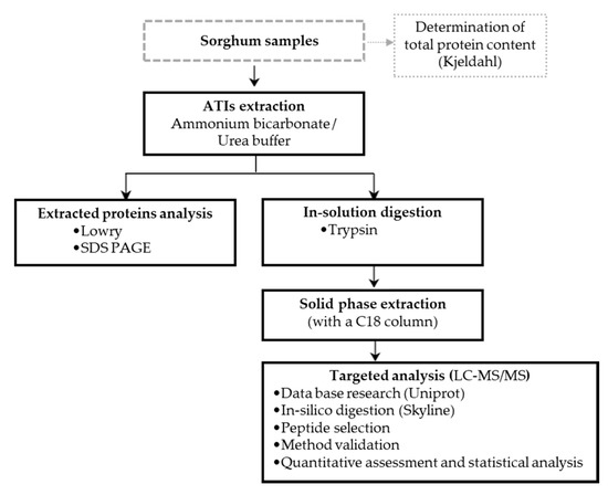 Figure 5 presents the workflow of the respective processing steps. Sorghum samples were first analyzed in order to determine their protein content according to Kjeldahl. Extraction was then performed using the flour samples following by the trypsin digestion. The solid phase extraction (SPE) was used to clean the samples after which LC–MS/MS analyses were carried out.