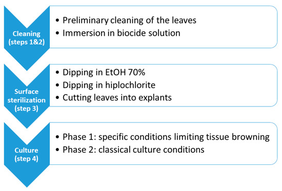One important step for aseptic culture establishment is the surface sterilization of the explants. First, several ways to produce surface-sterilized leave explants were explored. We wanted to test if it was possible to design a “universal” methodology, “universal” in the sense that the methodology could be used to establish in vitro cultures from (almost) any plant species. This hypothesis was quite challenging if we refer to what is usually done. Indeed, classically, the conditions of the surface sterilization procedure are optimized in function of the plant species [25,26,27] and the susceptibility of its tissues in order to obtain explants with both the best decontamination rate and with tissues having a good viability.