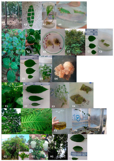 Establishment of in vitro leaf tissue culture for eight plant species: from leave samples collected in natura to in vitro cultures. Swietenia macrophylla’s trees (A1), leaf and explants (A2), axenic plantlets (A3) and calli (A4); Peperomia pellucida’s plants and leaves (B1,B2), callus (B3); Phyllantus brasiliensis’s plant (C1), leaves (C2) and explants on solid medium (C3); Clidemia hirta’s plant (D1), leaves (D2), axenic plantlets (D3) and callus (D4); Physalis angulata´s plant (E1), leaves (E2), axenic plantlets (E3) and calli (E4); Stryphnodendron pulcherrimum ´s tree (F1), leaves (F2), surface sterilization process (F3), axenic plantlets (F4); Vatairea guianensis´s tree and leaves (G1) precleaning step of the leaves (G2); Calycophyllum spruceanum´s tree (H1) and leaves (H2).