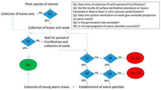 Of course, this alternative method is more time consuming and involves more resources than harvesting leaves in natura, but it also allows us to generate pools of plantlets that will be an endless source of aseptic explants. As a consequence, it should be considered in combination with the previous strategies (applying the procedure of leaves surface sterilization with possible adaptations) for the plant species for which these strategies were not so propitious or favorable (ex: low decontamination rate and/or poor tissues aspect). In summary, we propose in Figure 4 a flowchart for the establishment of in vitro leaf tissue culture as “universal” as possible. We tried to generalize, from our results, the whole process considering the different questions that will drive the choices among the several alternatives presented here: (i) if the procedure of surface sterilization on leaves harvested in natura gives favorable results, (ii) if the decontamination rate of seeds and their germination rate are workable, (iii) if it is feasible to micro-propagate the plantlets generated. Furthermore, if the species of interest consist of tree species, it may be advisable to wait for the period of collection to coincide with fructification, as it can be less easy for some woody species to get favorable conditions for the establishment of in vitro cultures [36].