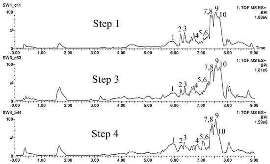 Ten secondary metabolites were used in the comparison of the BPI of S. macrophylla leaf explants extracts. These marker compounds belong to the class of limonoids, which are taxonomic markers of the species. The mass spectra of these compounds were compared with those obtained from the substances isolated and identified by our group [12,40,41]. The chromatographic profiles of the samples (Figure 6) associated with the four steps were compared to obtain a preliminary evaluation of the procedure. The ions corresponding to all ten limonoids were identified in all samples (steps 1 to 4), as listed in Table S2. The culture establishment procedure did not seem to influence the metabolic production of these compounds.