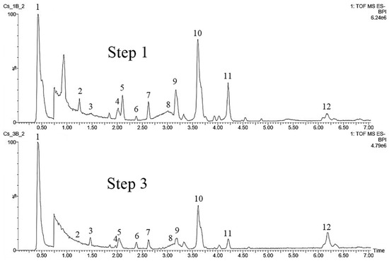 The peaks for the twelve substances, listed in Table S4 and shown in Figure 8, were monitored in the negative mode to evaluate the impact of the steps of the culture establishment procedure on C. spruceanum samples. Six peaks were identified based on comparison with literature [52,53,54,55,56] data as: 1-quinic acid; 2-caffeoylquinic acid; 3-(epi)catechin dimer; 8-(epi)catechin trimer monoglycoside; 9-quercetin 3-O-α-arabinopyranosyl (1→6) p-glucopyranoside; 10-kaempferol 3-O-β-D-glucopyranosyl (1→2)-β-D-xylopyranoside. By comparison of BPIs of steps 1 to 4, it can be observed, based on the target compounds and the global BPI profiles, that the cleaning and the surface sterilization procedures do not seem to alter the samples composition profile for this plant species.