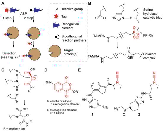 ABPP makes use of chemical probes that covalently bind to an active target enzyme or enzyme family but not to inactive counterparts. They do so by making use of a mechanism-based reaction with active site residues. These activity-based probes (ABPs) (see Figure 1A) usually consist of three elements.