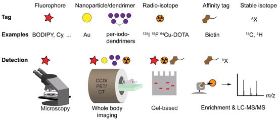 - A tag that enables detection of the covalent probe-protein complex [18]. Various tags have been used in ABPP, including biotin, fluorophores, radioisotopes, stable isotopes, and nanoparticles. The introduced tag determines which possibilities are available for read-out. Many studies use the abovementioned tags for visualization of biomolecules after separation by SDS-PAGE. Other possible detection methods include fluorescence microscopy, tandem mass spectrometry (after biotin-mediated enrichment), positron emission tomography (PET), and X-ray computed tomography (CT) (see Figure 2).