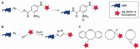 A few years later, Bertozzi and co-workers improved upon their previous approach by designing a carbohydrate derivative equipped with an azide as a mini-tag. After metabolic incorporation into cell surface glycans, the azide can undergo selective ligation with a biotin-tagged phosphine reagent, a bioorthogonal reaction that has become known as the Staudinger–Bertozzi ligation [21] (Figure 3A). Over the following two decades, an expanding repertoire of different reagents and transformations havw been explored, with over 20 types of bioorthogonal ligation reactions reported to date (see for recent reviews [22,23]). These reactions have been used to label various biomolecules, making use of suitably tagged metabolic precursors to introduce desired mini-tags into glycans [24], proteins [25], lipids [26], and nucleic acids [27]. In addition, bioorthogonal chemistry has also found application in other contexts, including drug delivery [28], radiolabeling [29], and in the field of ABPP [30,31,32]. The various types of bioorthogonal ligations that have been used in the context of ABPP will be described below.
