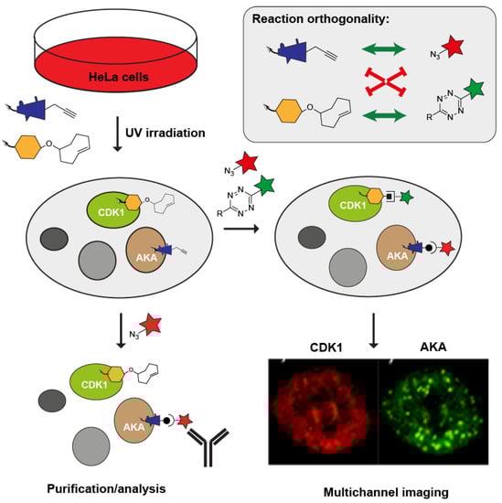 Orthogonality between bioorthogonal ligation reactions enables the simultaneous profiling of multiple enzyme targets. Figure exemplifies the experiment performed by Su et al. demonstrating subcellular localization of two cell cycle regulating kinases, cyclin-dependent kinase 1 (CDK1), and Aurora Kinase A (AKA). By using a two-step labeling approach, the same experimental samples could be used for enrichment as well as for imaging of the proteins. Fluorescent image taken from [82].