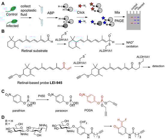 Profiling and discovery of enzymes by ABPP. (A) Schematic representation of DIGE-ABPP. Apoplastic fluid—or any other proteome—is labeled with a clickable probe, followed by CuAAC-mediated introduction of a different fluorophore in each sample. Next, samples can be mixed and analyzed. Whereas mixed colors (purple for both red and blue fluorophores) indicate similar activity of the probe targets, red or blue fluorescence reveals targets that are active only in control or infected sample. (B) Comparison of retinal with retinal-derived probe LEI-945 and its binding mechanism to aldehyde dehydrogenase ALDH1A1. (C) Structures of the pesticide parathion, the metabolite paraoxon, and the derived probe PODA. (D) N-Acetylglucosamine- and chitobiose-based ABPs and their binding mechanism: after cleavage of the carbohydrate moiety, a quinone-methide electrophile is formed, which reacts with a nearby nucleophile.