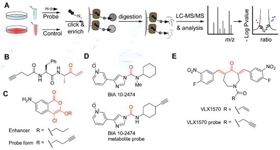 Target identification in ABPP by making use of bioorthogonal chemistry. (A) Schematic overview of a general workflow for target identification of ABPs. Live cells or a cell lysate are treated with a clickable probe. Recommended is a control experiment without a probe or with a competitive inhibitor. After cell lysis, CuAAC with a biotin-tagged reagent, and enrichment on immobilized streptavidin (in brown), tryptic digestion yields peptides for LC-MS/MS analysis and data processing, for example by volcano plot, as depicted. Note 1: the control experiment can be isotopically labeled, e.g., by SILAC (stable isotope labeling by amino acids in cell culture) or tryptic peptides can be labeled with heavy and light isotope labels before mixing. Alternatively, label-free quantification can be used. Note 2: Proteins may also be eluted prior to digestion in order to identify the modified peptide. Alternatively, after ‘on bead’ digestion, the modified peptide may be released by making use of, for example, a cleavable linker. (B) Alkyne-tagged ABP based on an inhibitor of attachment and invasion of the Toxoplasma parasite. The reactive electrophile is shown in red. (C) Structure of an enhancer of Toxoplasma invasion into host cells and an alkynylated derivative with the reactive electrophile in red. (D) Structure of FAAH inhibitor BIA 10-2474 and a probe derived from a de-methylated metabolite (electrophilic carbonyl in red). (E) Structure of DUB inhibitor VLX1570 and an alkyne-tagged probe form. Note that the two Michael acceptor systems (in red) can lead to crosslinking of proteins.