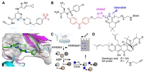 Detection of ABP binding sites and competitive ABPP. (A) Structure of a sulfonyl fluoride probe for kinases (upper; reactive group in red) and a co-crystal structure with Src kinase (lower panel) in which Lys295 has reacted with the sulfonyl fluoride. (B) Avagacestat-derived probe with a photoreactive group (in red), pre-clicked onto a biotin-azide reagent with an incorporated hydrazine-sensitive cleavable linker (cleavable bond in blue). (C) Schematic representation of competitive ABPP with click chemistry. Treatment with an inhibitor will block the active site on one or multiple targets, after which a broad-spectrum ABP is added to measure residually active enzymes. (D) Structure of gambogic acid (GA) and an alkyne-conjugated GA probe.