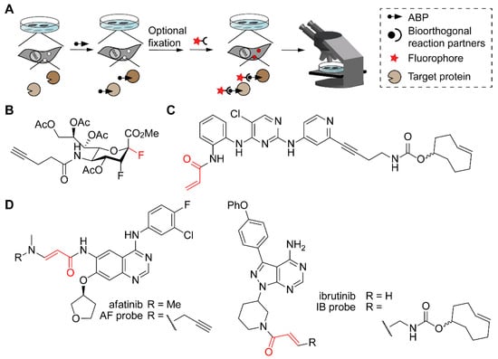 ABPP with fluorescence microscopy as read-out, which provides information on the (subcellular) location of the ABP targets. (A) Schematic representation of the workflow. Cells in culture are treated with an ABP. Depending on the bioorthogonal reaction, fixation may be necessary (e.g., in case of toxic conditions or non-cell permeable reagents). Bioorthogonal reaction then allows the introduction of a fluorophore, after which cells are imaged by a fluorescence microscope. (B) Structure of a fluorosialyl fluoride probe (reactive site in red). Note that the ester groups will be hydrolyzed by intracellular esterases to convert this molecule into the active probe. (C) Structure of the ERK1/2 targeting probe designed by Heightman et al. (reactive group in red) with a TCO as the bioorthogonal handle. (D) EGFR-targeting probe based on the drug afatinib (left) and BTK-targeting probe based on ibrutinib (right).