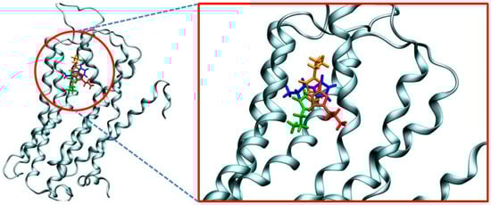Apart from being positioned in the same binding pocket, a closer analysis of the predicted binding poses shows that all histamine molecules are located in the area between third and fifth transmembrane α-helices, in line with many earlier literature reports on the binding of H2 receptor ligands [28,29,30]. This provides some credence to the obtained results, which is further promoted by the calculated binding affinities. Namely, Figure 2 shows that the most favorable pose is associated with the binding energy of −7.4 kcal mol−1, which very well agrees with the experimental value of −5.9 kcal mol−1 obtained from the measured pKi value of 4.3 [31]. Lastly, let us briefly mention that we have repeated the identical docking procedure for the less stable N1–H (Nπ) histamine tautomer, and the results showed an analogous placement within the H2 receptor and the identical binding energy of −7.4 kcal mol−1. Still, due to a described lower stability and the matching lower population of this tautomer relative to its N3–H analogue, N1–H tautomer was not considered further.