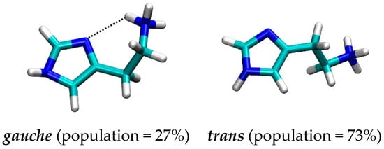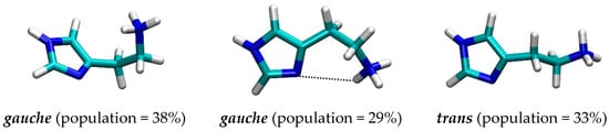 Representative conformations with their population of the histamine monocation in aqueous solution as obtained by the molecular dynamics simulation.