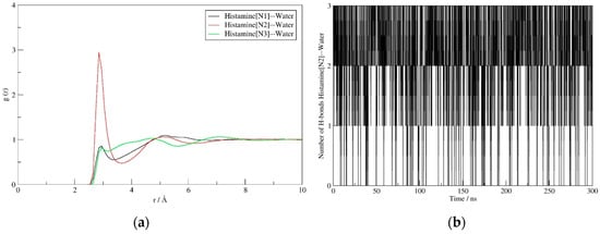 The interactions governing the hydration of histamine also reveal interesting trends. All three nitrogen sites (N1–N3) represent crucial locations to interact with water, with the corresponding RDF displays demonstrating an equal solvent ability to approach them (Figure 4a). Specifically, for all three positions, the predominant interactions are established at the N (histamine)∙∙∙O (water) distances of around 3 Å, which corresponds to rather strong hydrogen bonds in all cases. The interactions with both N-positions within the imidazole ring show identical patterns, thus indicating that N1 and N3 sites are participating as hydrogen bond acceptor and donor, respectively, with one water molecule in the first hydration shell. The latter is nicely evident in the average number of hydrogen bonding contacts, being 1.2 and 0.7 for N1 and N3, respectively. On the other hand, the interaction with the cationic N2 site is much more frequent, while around three times higher peak for N2 is only partially justified by the fact that the protonated amino group has three equivalent N2–H bonds that can potentially interact with three water molecules at the same time. As a matter of fact, Figure 4b advises that the actual number of hydrogen bonding contacts for this group is predominantly between 2 and 3, with an average value during simulation of 2.2, which is likely due to steric reasons and the exchangeability of individual solvent molecules. In addition, the shape of the RDF curve and a slightly lower distance for the peak maximum for N2 (2.8 Å relative to 2.9 Å for both N1 and N3), also suggests that its interactions with the solvent molecules are stronger than with the other two nitrogen sites. This notion is found in excellent agreement with our earlier report [24], where we utilized the Car-Parrinello molecular dynamics simulation scheme to delineate the experimental IR spectra of histamine in water, which showed a broad feature between 3350 and 2300 cm−1 including a mixed contribution from the ring N3–H and the aminoethyl N2–H stretching vibrations, to indicate that the ring amino group absorbs at higher frequencies than the remaining three amino N2–H protons, thus implying the latter forms stronger hydrogen bonding with the surrounding waters.