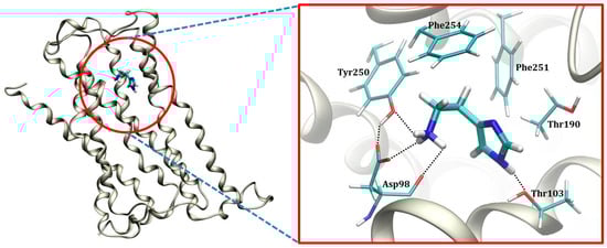 The contribution of crucial binding residues is presented in Table 1, while a representative snapshot from the MD trajectory is shown in Figure 5. The specific residues considered for the analysis are those whose favorable contribution exceeds −0.06 kcal mol−1 and those with unfavorable contribution over +0.02 kcal mol−1, in total 18 residues each. It turns out that the most dominant interaction that histamine establishes within the H2 binding site is that with Asp98, which accounts for almost 40% of the binding energy, being a significant observation. It is established through charge-charge interactions among the protonated amino group on histamine and the anionic carboxylate side chain of Asp98, being highly persistent through the entire simulation, while typically involving N–H∙∙∙∙∙O hydrogen bond with only one of the carboxylic oxygen atoms (Figure S3). The reason for the latter is the fact that, besides Asp98, the protonated histamine −NH3+ group has the potential to interact with the –OH group on the nearby Tyr250, which is locked in the position through donating a hydrogen bond to the other carboxylic O-atom on Asp98 (Figure 5). The mentioned histamine∙∙∙Tyr250 interaction is also persistent during simulation (Figure S4, top), evident in a favorable Tyr250 contribution of −0.83 kcal mol−1, while Tyr250∙∙∙Asp98 hydrogen bonding is absent in the beginning, but, once formed, it remains stable during the second half of the trajectory (Figure S4, bottom).