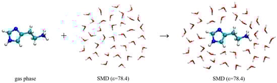 The hydration energy, ΔEHYDR, is calculated using a reaction scheme depicted in Figure 7 and the obtained values are given in Table 2. This approach relies on transferring histamine from the gas phase into the aqueous solution and forming a hydrated solute-solvent complex. In water, the hydration energy is calculated as −71.63 kcal mol−1, indicating that the histamine monocation is well solvated and stabilized in water. This value is reduced in D2O, as a result of modified hydrogen bonding interactions and their strength following deuteration, and assumes −71.20 kcal mol−1, a small effect of only 0.43 kcal mol−1 in favor of H2O. This implies that the hydration, on its own, works in the direction of promoting the binding of a deuterated system to the receptor.