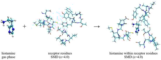 Following molecular dynamics simulation, which identified receptor residues crucial for the binding and a representative cluster of 36 water molecules in the aqueous solution, quantum-chemical calculations at the M06–2X/6–31+G(d) level utilized the empirical quantization of the acidic X–H bonds (X = N, O, S) to support the increased histamine affinity upon deuteration. The overall binding was separated in two contributions, that from the interaction with the receptor and the one arising from the interaction with the solvent preceding the binding, which were both modeled through a cluster-continuum approach utilizing the implicit SMD solvation with the dielectric constants of ε = 4.0 for the receptor environment, and ε = 78.4 for the aqueous solution. The used computational setup gave the calculated difference in the binding free energy of −0.85 kcal mol−1, being in excellent agreement with the measured value of −0.75 kcal mol−1, thus confirming the relevance of hydrogen bonds for the receptor activation.