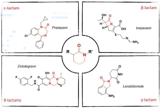 In recent years, substituted lactams have emerged as an important pharmacophore for several drug classes, with a large spectrum of biological outcomes and various therapeutic applications [,,]. From a structural standpoint, they can be four-, five-, six- and seven-membered rings, called β-lactams, γ-lactam, δ-lactam and ε-lactam, respectively. Several drugs with a lactam structure have already reached the market, and a few representative examples are reported in Figure 1. These include antibiotics with a β-lactam structure (i.e., penicillins, cephalosporins, monobactams, carbapenems) [], the γ-lactam Lenalidomide (a derivative of Thalidomide endowed with immunomodulatory and antiangiogenic activity) [,], the δ-lactam Dolutegravir (a HIV-1 integrase inhibitor) [] and benzodiazepines based on the ε-lactam scaffold (i.e., Prazepam), well known allosteric modulators of the receptor GABA A. [].