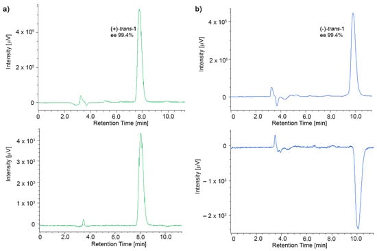 UV trace (up) and ECD trace (down) of the first eluted (+)-trans-1 (a) and the second eluted (−)-trans-1 (b) using Chiralpak IA, mobile phase M (Table 1).