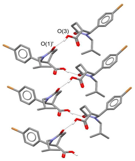 At the solid state, adjacent molecules are linked together by means of O-H···O hydrogen bonds, where the OH of the carboxylic group acts as H-donor and the O atom of the carbonyl group is the H-acceptor. The geometrical features of the O-H···O interaction are: O(3) ···O(1)’ 2.613(7) Å, H(3O) ···O(1)’ 1.74(3) Å, O(3)-H(3O)···O(1)’ 163(8)° (symmetry code: (‘) = 1/2 + x, 1/2 − y, 1 − z), and these interactions originate a supramolecular double chain of (+)-(2R,3R)-1 molecules extending along the direction of the a crystallographic axis (Figure 7). The supramolecular synthon [] originating from this H-bond motif can be described with the graph set notation C(8) []. Inspection of the available structural data in the literature [] shows that such a synthon occurs in different crystal structures of several δ-lactam derivatives having the carboxylic group at the 3-position of the ring [,,,]. To sum up, the absolute configuration of the first eluted (+)-trans-1 was elucidated through X-ray diffraction experiments and both chiral C centers resulted R-configured.