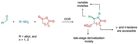 Given the high interest in lactams, extensive efforts have been directed towards the identification of versatile synthetic strategies for obtaining lactams. Among the different methodologies exploited so far, it is worth mentioning the Beckmann rearrangement, the Staudinger procedure and the Schmidt reaction as well as cascade, tandem and multi-component reactions [,]. From the perspective of efficiency, medicinal chemistry projects can advance faster with simple reactions that can use easily available reagents (e.g., amines, aldehydes and carboxylic acids) and that require low optimization procedures. Such reactions can be successfully used for preparing compound libraries with a high degree of molecular diversity, thus speeding up the drug discovery process. From this perspective, the Castagnoli-Cushman reaction (CCR) seems to be a robust procedure suitable for affording γ- or δ-lactams with two points of structural variability, plus one additional carboxylic portion offering a site for derivatization in one or more steps, and two stereogenic centers (Scheme 1). The CCR generally proceeds with a high degree of diastereoselectivity, yielding predominantly the trans-configured racemic mixture [,,,,]. Recently, Ryabukhin et al. successfully applied the CCR for preparing a potential lead-oriented library based on a lactam scaffold. Specifically, starting from two different anhydrides, 44 aldehydes and 44 amines, and applying a one-pot parallel synthesis procedure, they prepared a series of 132 lactams with high yields [].