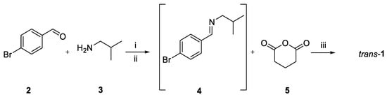 δ-lactam 1 was synthesized via the CCR following the protocol already described by our team with suitable modifications (Scheme 2) []. Briefly, 4-bromobenzaldehyde and isobutylamine were reacted in toluene to generate imine-intermediate 4 in situ. The 4-bromobenzaldehyde group was chosen to facilitate the AC assignment by the X-ray diffraction analysis. To remove water and favor the formation of imine 4, molecular sieves (4 Å, MS) were added []. Then, the carboxylic resin IRC50 was added to scavenge the unreacted isobutylamine, thus preventing the formation of side-products. Finally, the mixture was filtered and the solvent was evaporated. Intermediate 4 was then reacted with glutaric anhydride in p-xylene and the mixture was refluxed to form the desired δ-lactam. After liquid/liquid extraction, followed by flash chromatography, the final compound trans-1 was successfully isolated with high purity (95%, cis/trans ratio: 10/90) and a satisfactory yield (38%).