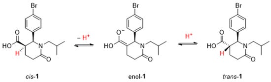 δ-lactam 1 was synthesized via the CCR following procedure outlined in Scheme 2. Consistent with literature data, the reaction proceeded with high diastereoselectivity, predominantly yielding the trans isomer 1 (cis/trans ratio of 10/90, NMR analysis, see Supplementary Material Figure S1 and Table S1), as confirmed by NOE experiments (see Supplementary Material Figure S2) [,]. The observed stereoselectivity is due to the fact that the reaction is performed under thermodynamic control (p-xylene, reflux, 140 °C, 10 h) and, therefore, the main product will be the most thermodynamically stable. Since the trans product has less steric collision between the aromatic group and the carboxylic acid, it is formed mainly under reversible conditions. As outlined in Scheme 3, the position of the stereocenter attached to the carboxyl group is enolizable and this explains the cis/trans equilibrium in which the trans product predominates. Furthermore, the obtained cis/trans ratio is in accordance with the analysis reported in Figure 4, in which the UV chromatogram shows a broad peak at tr = 6.4 min with 10% of peak area attributable to racemic cis-1 (two peaks with opposite sign are present in the ECD trace). Overall, the synthetic protocol afforded quick, easy and efficient access to the desired product.