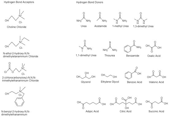 One of the approaches used to synthesize DESs is by mixing and heating two or more salts to form a homogenous solution. Typically, ambient temperature molten salts have been formed by mixing quaternary ammonium salts, a hydrogen bond acceptor (HBA) with metal salts [32,33]. Hence, four main different types of DES occur: I. quaternary salt with a metal chloride, II. quaternary salt with a hydrated metal chloride, III. quaternary salt (HBA) with an HBD compound and IV. metal chloride with an HBD. The respective general formulas of the four types are shown at Table 1. The first two types are used to synthesize hydrophilic DESs, whilst the other two for hydrophobic DESs [20,34]. Due to the stability in the aquatic solutions which type III and IV provide, they are often utilized in many papers, with choline chloride (ChCl) being the most used HBA. In Figure 1, some common HBA and HBD are shown.