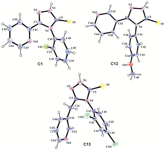 The molecular and crystal structures for C1, C12, and C13 were determined using the X-ray analysis method to confirm the assumed molecular structures, identify their tautomeric form, and find conformational preferences and intermolecular interactions observed in the crystalline state. The crystal and molecular structures of 4-(2-chlorophenyl)-3-(pyridin-2-yl)-1,2,4-triazolin-5-thione, C2, and 4-(2,4-dichlorofenylo)-3-(pirydyn-2-yl)-1,2,4-triazolino-5-tion, C3, were reported earlier [26]. The structure and conformation of the molecules C1, C12, and C13 in the crystal are presented in Figure 1.