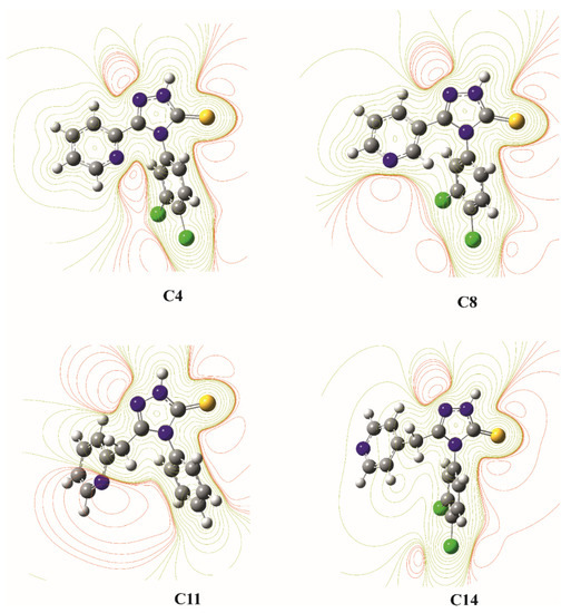 The contour maps of molecular electrostatic potential for compounds C4, C8, C11, and C14 in the plane of the 1,2,4-triazole ring; the red lines represent regions with the negative electrostatic potential and yellow lines represent regions with the positive electrostatic potential.