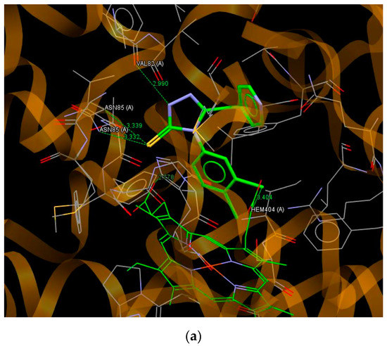 It can be seen that the values of the scoring function ChemPLP for all ligands are in a relatively narrow range. The highest value of ChemPLP of 68.29 is obtained for compound C14, while the lowest value of 53.67 is observed for compound C8. For the most active compound C4, the scoring function has a value of 57.68. Relatively higher values of ChemPLP are observed for pyridilmethyl derivatives containing a methylene linker between the 1,2,4-triazole and pyridine ring. Almost all ligands bind to the active site of cytochrome P450 via S5… C hydrogen bonds with MET62 and the heme molecule. The nitrogen atoms of the 1,2,4-triazole (N1 and N2) and pyridine ring play an important role in the interaction with the active site of cytochrome P450 through hydrogen bonds with the residues of VAL82, PHE280, ARG386, SER237, ASN85, and MET62. The interactions of the best fitted to the binding site of P450 CYP121 compound C14 are shown in Figure 4a. This ligand binds to the active site by hydrogen bonds N1… O (VAL82), S5… N(ASN85), S5… C(ASN85) and Cl43… C(HEME). The most active against Mycobacterium Tuberculosis compound C4 is bound to the binding pocket of cytochrome P450 enzyme via hydrogen bonds N2…C(PHE280), Cl44…C(MET62) and S5… C, C45… O and C46… O with the heme molecule (Figure 4b).
