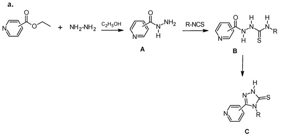 The mixture of 0.01 mol appropriate carboxylic acid hydrazide (A), 20 mL methanol, and 0.01 mol of commercially available isothiocyanates was heated for 0.5–1 h at reflux temperature. After this time the mixture was cooled and the resulting precipitate was filtered off and crystallized from ethanol.