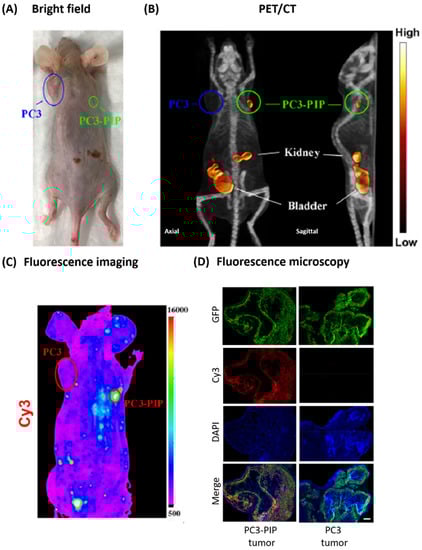 Selective PET and fluorescence imaging of PSMA-expressing (PC3-PIP) tumors compared to non-PSMA-expressing tumors (PC3) on a xenografted mouse model with PSMA-targeting probe [18F]12. (A) Bright-field image. (B) PET/CT imaging 6 h post-injection. (C) Whole-body fluorescence imaging of compound 12 showing selective accumulation in PSMA-expressing tumor. (D) Fluorescence microscopy of tumor sections. Compound 12 was selectively accumulated in PC3-PIP tumors (left column) as opposed to PC3 tumors (right column). Scale bar is 250 μm. Adapted with permission from []. Copyright 2019 American Chemical Society.