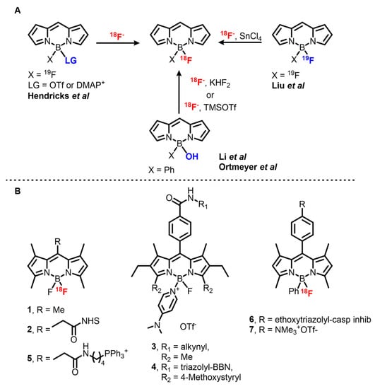 Since their first report in 1968 by Treibs and Kreuzer, 4,4-difluoro-4-bora-diazaindacenes (BODIPYs) have been thoroughly studied and are now considered to be one of the most important families of organic fluorophores []. Locking of the cyanine monomethine backbone by the boron atom confers to BODIPYs excellent (photo)stability, high extinction coefficients (ε), high quantum yields (ΦF) in solution, sharp absorption bands, and sharp emission bands, positioning them as a dye of choice for many applications [,]. Moreover, possible NIRF emission and global neutrality of these dyes are of particular interest for imaging purposes. One drawback of BODIPY dyes is their low Stokes shifts (usually below 1000 cm−1), reducing signal-to-background ratio due to reabsorption and use of narrow filters. Nowadays, biomedical applications of BODIPY dyes are mainly focused on cellular imaging and sensing, however, examples of NIRF OPI and photoacoustic imaging (PAI) have been described [,]. Given the importance of BODIPY dyes as fluorescent probes, several groups have been involved in the development of dual-mode imaging agents including OPI-PET, OPI-SPECT, or OPI-MRI [,,]. Recently, Ali et al. published an overview of radiolabeled BODIPYs in the literature including 125I, 111In, and 89Zr adducts []. The majority of 18F-BODIPYs are labeled on the boron center (Scheme 1), however, the first example reported by Perrin et al. describes radiolabeling via the use of a boronic ester []. This work is one of the first of a series on boronic ester-mediated 18F radiolabeling. This method is more often used for the radiosynthesis of xanthene- and cyanine-based tracers and is further detailed in the related sections (vide infra). Other methods rely on the presence of the central boron atom and can be classified into three types, one based on two or three steps labeling through an activated intermediate and the others based either on hydroxy substitution or on direct isotopic exchange (IEX), both acid-catalyzed.