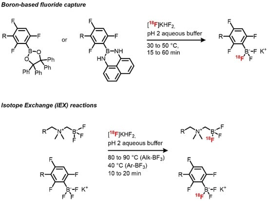 18F boron trifluoride xanthene derivatives can be achieved by fluoride capture by a boron-containing reactive group and by IEX on boron trifluoride species (Scheme 3) [,]. The use of inorganic fluoride captors has been applied to radiochemistry in order to allow late-stage labeling of biomolecules with high molar activities, and boron-based prosthetic groups have been used in the design of several prosthetic groups [,]. Radiosynthesis using the IEX reactions has been previously demonstrated on organic molecules, then followed by silicon- and boron-based prosthetic groups. Boron trifluoride derivatives as radiolabeling precursors of fluorescent compounds were first described by the team of Perrin. These groups proved to be useful for late-stage radiolabeling thanks to the high rates of exchange and the slightly acidic reaction conditions, allowing their use on a wide range of compounds. In the case of xanthene dyes, [18F]sulforhodamine B was quickly (10–15 min of reaction time) afforded with d.c. RCYs between 45 and 75%, high RCPs, and very high Am (up to 14.3 Ci/μmol), allowed also by the use of a low amount of precursor []. Other advantages of this method are the absence of 18F drying step and prolonged heating (40 °C), which respectively shortens the synthesis and potentially allows the application of this method to a broad scope. The only drawback of this method resides in the slight instability of aryl boron trifluorides that are partially hydrolyzed during the reaction, giving rise to the formation of the corresponding boronic acid. However, in this case, the side product is well defined from the targeted one and can be easily removed by preparative HPLC.