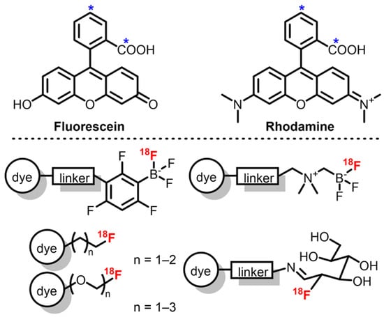 General structure of fluorescein and rhodamine dyes (blue stars * indicate positions used for prosthetic group linkage) and structures of described prosthetic groups used in xanthene dyes radiofluorination.