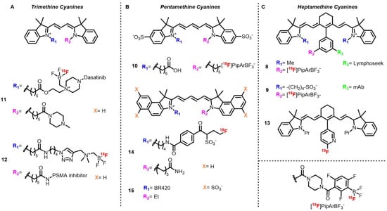 Structures of described 18F-labeled trimethine (A), pentamethine (B), and heptamethine (C) cyanine dyes.