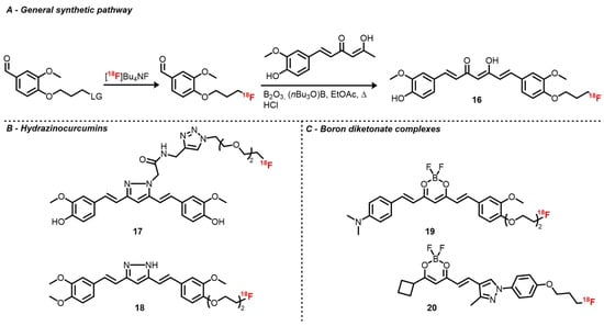 (A) General radiosynthetic pathway of classical 18F-curcumin derivatives. Structures of radiofluorinated boron diketonate analogs (B) and hydrazinocurcumins (C).
