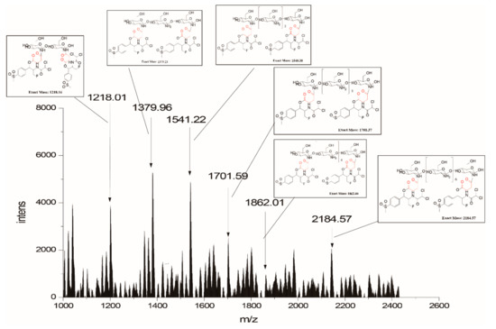 The conjunction between florfenicol and COS was proved by Matrix-Assisted Laser Desorption/Ionization Time of Flight (MALDI-TOF) Mass Spectrometry analysis. Interestingly, the result showed that each COS oligomer (COS 2-COS 8) conjugated to two florfenicol molecules (Figure 3). Unmodified COS oligomers showed peaks from m/z 341.35 to 1326.33 with a 161.0 Da mass difference (GlcN residue) between each two peaks (Supplementary data, Figure S1). The spectrum of the F-COS conjugate showed peaks at m/z 1218.01, 1379.96, 1541.22, 1701.59, 1862.01, 2184.57 represented COS disaccharides, trisaccharides, tetrasaccharides, pentasaccharides, hexasaccharide, octasaccharides conjugated with two molecules of florfenicol, respectively. The heptasaccharide-florfenicol conjugate was not detected, possibly due to the relatively low content of heptasaccharide in the COS product used in the experiment.