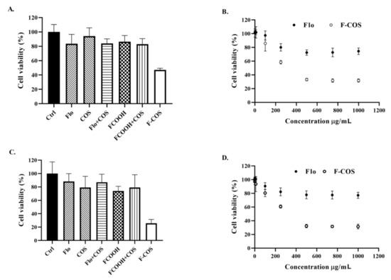 F-COS eradicated Streptococcus hyovaginalis biofilms. The anti-biofilm activity of F-COS, florfenicol (Flo), COS, a 1:1 mixture of florfenicol and COS (Flo + COS), Flo-COOH (FCOOH), a 1:1 mixture of FCOOH and COS (FCOOH + COS) were tested against mature biofilm of Streptococcus hyovaginalis (A) or planktonic cells cultured in biofilm formation condition (C), at a concentration of 250 μg/mL. The concentration-dependent of anti-biofilm activity of F-COS against mature biofilms (B) or inhibiting biofilm formation (D) were shown. Data are represented as means ± SD (n = 6) of cell viability compared to the untreated group.