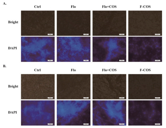 Micrographs of Streptococcus hyovaginalis biofilm cells treated with F-COS. Mature Biofilm (A) or planktonic cells cultured in biofilm formation condition (B) exposure to 0.25 mg/mL F-COS, florfenicol (Flo), a 1:1 mixture of florfenicol and COS (Flo + COS) were stained with 1 µg/mL DAPI and observed under confocal microscopy. Scale bars, 20 μm.