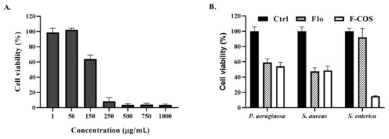 F-COS showed Broad-spectrum antibacterial activities. The antibacterial activity of serial dilutions of F-COS against vegetative-growth Streptococcus hyovaginalis cells (A). The anti-biofilm activity of F-COS and florfenicol (Flo) was tested against the mature biofilm of Pseudomonas aeruginosa, Staphylococcus aureus, and Salmonella enterica at a concentration of 250 μg/mL (B). Data are represented as means ± SD (n = 6) of cell viability compared to the untreated group.