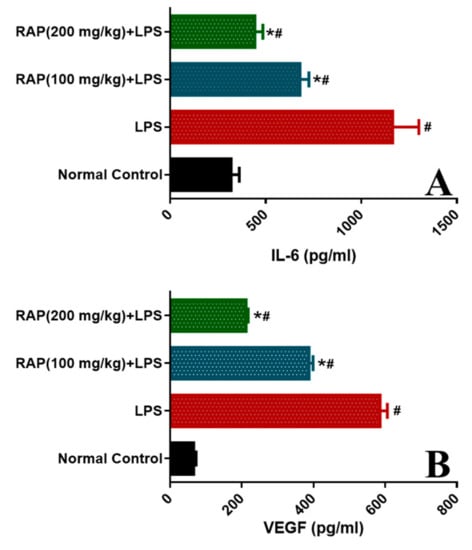 2.1. Effect of RAP on Levels of TNF-α, IL-1β, IL-6, and VEGF